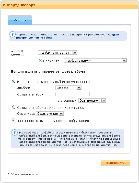 Данный модуль позволяет быстро добавить в альбомы фотографии из FTP папки. Необходимо указать папку FTP в которой находятся необходимые фотографии. Так же фотографии могут находится в подкаталогах, это позволит импортировать фотографии сразу в несколько альбомов с именами как у папок фтп. (см. рис. 56)