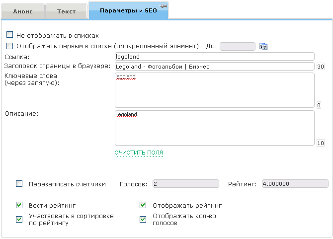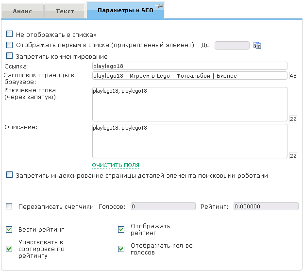 - Ключевые слова. Располагается на закладке «Параметры». Ключевые слова, характеризующие данный элемент. Данное поле будет выведено в мета тэг «keywords».