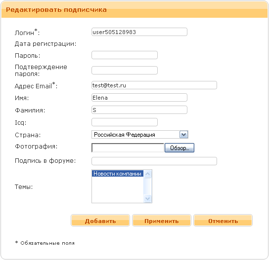 Поля формы редактирования (см. рис. 41) элемента подписчика содержат следующие параметры: