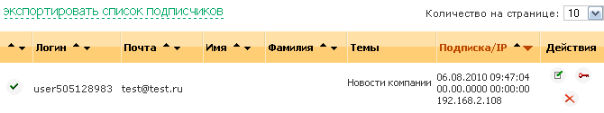 - Даты подписки и отписки пользователя. Для активных пользователей дата отписки выставлена в ноль. В колонке располагается также IP-адрес, с которого была произведена подписка.