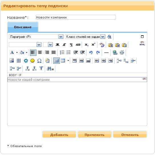 - Описание. Ввод текста осуществляется с помощью визуального редактора.
