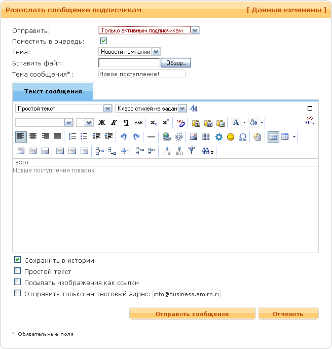 - Текст сообщения. Содержит непосредственно текст сообщения. Допускается ввод форматированного текста и размещение картинок в тексте сообщения. При отправке форматированного текста сообщение будет отправлено в формате html.