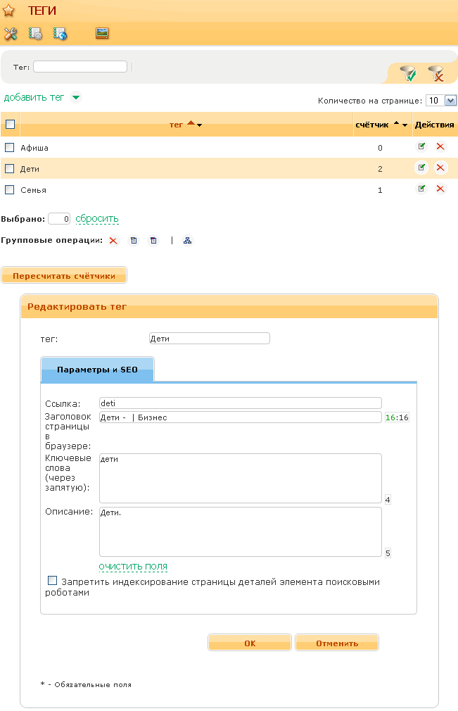 Рисунок 114 Кроме редактирования ранее введенных тегов и добавления нового тега в список, форма позволяет указать параметры страницы результата запроса по тегу (наименование ссылки на страницу, наименование страницы, ключевые слова и описание). |