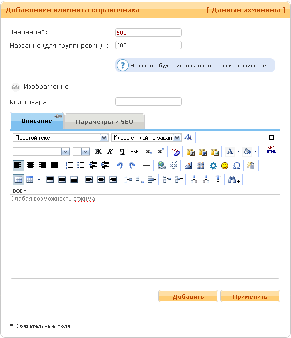 - «Описание» - может быть использовано как подсказка посетителю. Установим «Слабая возможность отжима».