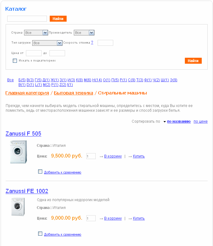 Итак, первый товар настроен и добавлен. Ознакомимся с результатами нашей работы на сайте. Переходим в публичную часть сайта. Можно перейти по быстрой ссылке из панели администратора «Просмотр результата». Открывается каталог товаров. Главная категория. Доступен поиск по названию товара, выбор товара по первой букве. Перечень категорий с анонсами. В настоящее время одна – «бытовая техника». Выбираем категорию «бытовая техника» и далее «стиральные машины». Доступен поиск по всем параметрам, которые были заданы для данного типа товаров (Производитель, цены, Скорость отжима и т.д.) Выбрав товар – доступно его дательное описание, ссылка на детальную картинку.