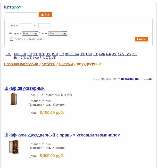 Ознакомимся с результатами нашей работы на сайте. Переходим в публичную часть сайта. Можно перейти по быстрой ссылке из панели администратора «Просмотр результата». Открывается каталог товаров. Главная категория. Доступен поиск по названию товара, выбор товара по первой букве. Перечень категорий с анонсами. Выбираем категорию «Мебель» и далее «Шкафы». Доступен поиск по всем параметрам, которые были заданы для данного типа товаров (Материал, Производитель, и т. д.)