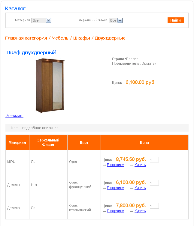 Рисунок 24 Выбрав товар – доступно его дeтaльное описание, ссылка на детальную картинку. Таким образом, мы проделали все необходимые шаги от базовой настройки до создания первого товара с собственной структурой свойств и сразу получили готовый и настроенный результат на сайте. Обращаем внимание на работы «подвидов». Можно осуществлять фильтрацию подвидов по заданным характеристикам (например, Материал, Зеркальный фасад). При заходе в детальное описание непосредственно конкретного шкафа мы видим перечень всех доступных моделей с остатками, пересчитанными по правилам влияния ценами и другими заданными параметрами. Здесь же есть возможность фильтровать данный перечень. Если в управлении подвидами отключить параметр «Показывать все доступные товары», то подвиды не будет показываться (их может быть очень много), но при использовании фильтра – будут отображаться попадающие под критерии. Здесь же можно сразу положить нужный товар в корзину и оформить заказ.
