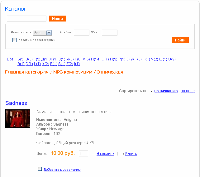 Ознакомимся с результатами нашей работы на сайте. Переходим в публичную часть сайта. Можно перейти по быстрой ссылке из панели администратора «Просмотр результата». Открывается каталог товаров. Главная категория. Доступен поиск по названию товара, выбор товара по первой букве. Перечень категорий с анонсами. Выбираем категорию «МР3 композиции». Доступен поиск по всем параметрам, которые были заданы для данного типа товаров (Исполнитель, Жанр, Альбом).