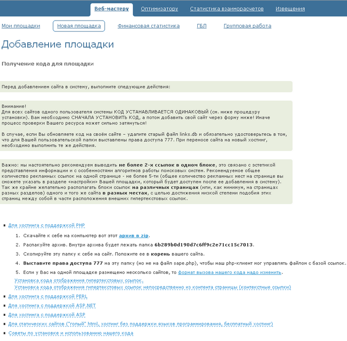 Переходим к добавлению площадки на сайте Sape. Выбираем тип площадки «Для хостинга с поддержкой PHP» (рисунок 5):
