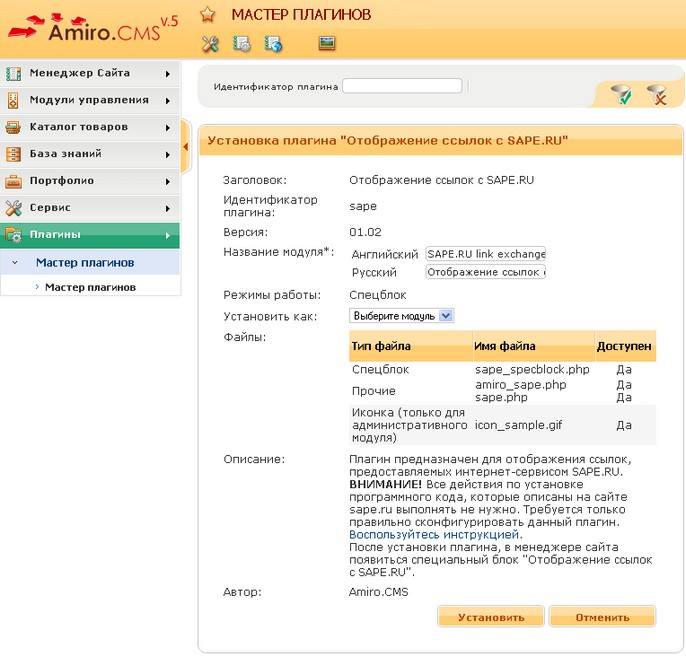Плагин «Отображение ссылок с SAPE.RU» предназначен для взаимодействия сайта на системе Amiro CMS с веб-сервисом Sape (подробнее о Sape смотрите на сайте http://sape.ru/). Установку следует начинать с установки плагина в панели управления вашим сайтом. Открываем модуль «Мастер плагинов» из раздела «Расширения». В списке плагинов находим плагин sape, и нажимаем на иконку «Установить». Откроется форма, изображенная на рисунке 1: