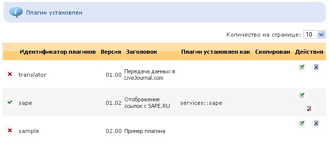 Параметру «Установить как» ставим значение «services::sape», нажимаем кнопку «Установить». Плагин установлен (рисунок 2):