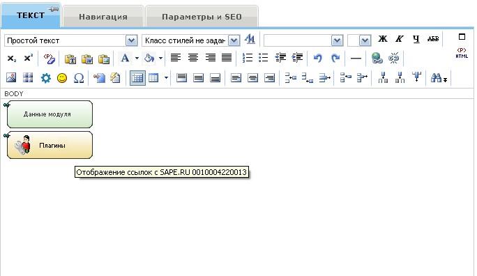 Теперь нужно выбрать место на сайте, в котором будут отображаться ссылки сервиса Sape. В качестве примера, пусть это будет нижняя часть страниц каталога Интернет магазина. В менеджере сайта находим требуемую страницу и открываем ее на редактирование. В блок «Текст» добавляем специальный блок «Отображение ссылок с SAPE.RU» (рисунок 3):