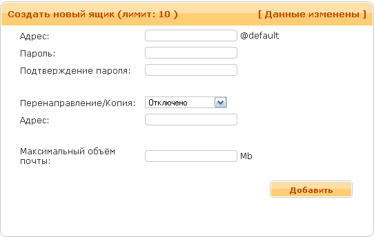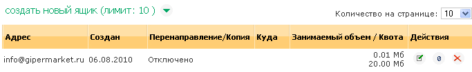 Содержит информацию о почтовых ящиках, позволяет создавать новые. Список элементов