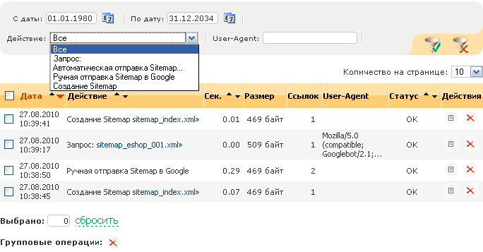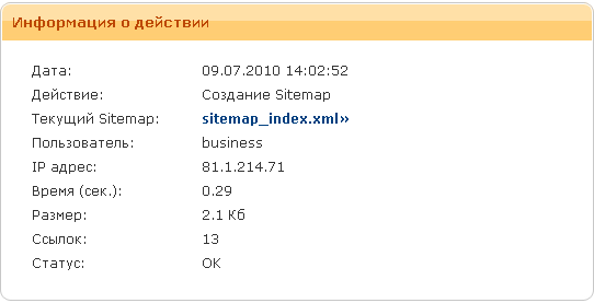 Результат работы сервиса – История СобытийОбработка файлов Sitemap поисковой системой может занять продолжительное время. Нельзя предсказать или гарантировать, будут ли ваши URL-адреса отсканированы или добавлены в поисковый индекс и когда это произойдет. Запросы файлов Sitemap поисковой системой вы можете контролировать в истории действий сервиса.