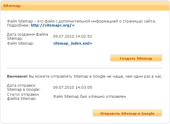 Отправить HTTP-запрос в Google вы можете с главной панели управления сервисом, нажав кнопку «Отправить Sitemap в Google». Внимание! Файл Sitemap может быть отправлен в Google не чаще, чем один раз в час.