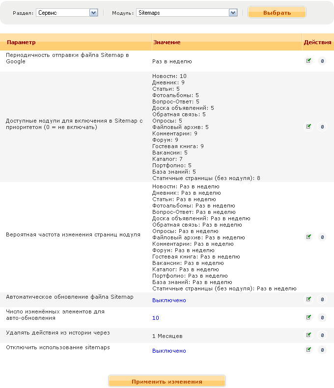 Сервис Sitemaps имеет ряд параметров, позволяющих настраивать работу сервиса: