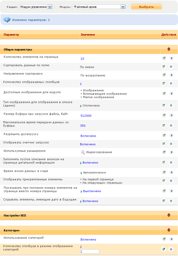 Сделаем список категорий в два столбца. Для этого зайдем в настройки файлового архива (Сервис – Настройка системы, в ниспадающих списках выбрать «Модули управления» и «Файловый архив») в разделе «Категории» для параметра «Количество столбцов в режиме отображения категорий» поставим значение «2»: