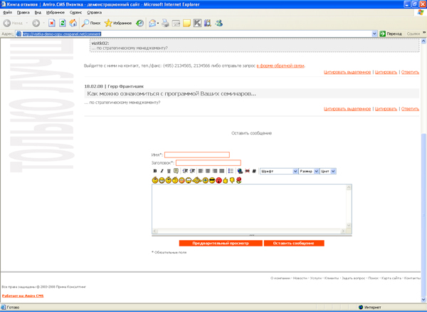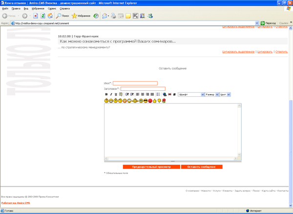 На странице «Книга отзывов» у нас установлен тип страницы «Гостевая книга». На сайте видим оформление «Гостевой книги»: