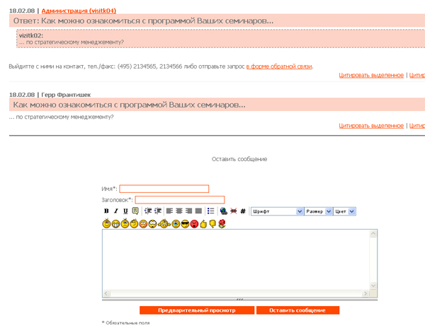 Здесь: %%author%% - языковая переменная «Имя» <input type="text" class="txt" name="author" size="35" value="" />- текстовое поле для ввода имени %%subject%% - языковая переменная «Заголовок» <input type="text" class="txt" name="subject" size="35" value="##subject##" /> - текстовое поле для ввода заголовка сообщения <script language="JavaScript" type="text/javascript"> var edLangData = new Array ( '%%bb_bold%%', '%%bb_italic%%', '%%bb_underline%%', '%%bb_quote%%', '%%bb_align_left%%', '%%bb_align_center%%', '%%bb_align_right%%', '%%bb_justify%%', '%%bb_insert_list%%', '%%bb_insert_link%%', '%%bb_delete_link%%', '%%bb_insert_image%%', '%%bb_font%%', '%%bb_size%%', '%%bb_color%%', '%%bb_more%%', '%%bb_insert_code%%', '%%bb_indent%%', '%%bb_outdent%%', '%%bb_preview%%', '%%bb_hide_preview%%', '%%bb_update_preview%%', '%%bb_warn_message_length%%', '%%bb_warn_invalid_image_url%%', '%%bb_warn_image_url_internal_links_forbidden%%', '%%bb_warn_image_url_external_links_forbidden%%' ); var txtEd = new amiroTEdit('txtEd', edLangData); txtEd.allowedImages = new Array (##allowed_images##); txtEd.createEditor(600, 250, 'message', '', false, 'amiroTEdDivPreview'); txtEd.setUseNoindex(##noindex_external_links##); txtEd.editorModeCode = "document.getElementById('amiroTEdPreviewHeader').style.display = 'none';"; if (location.toString().indexOf('#') > -1) { savePreviousOnLoadEvent(); addOnLoadEvent(function(){setTimeout('txtEd.editorObj.focus()',300)}); } </script> - вывод на экран блока для редактирования и отправки сообщения