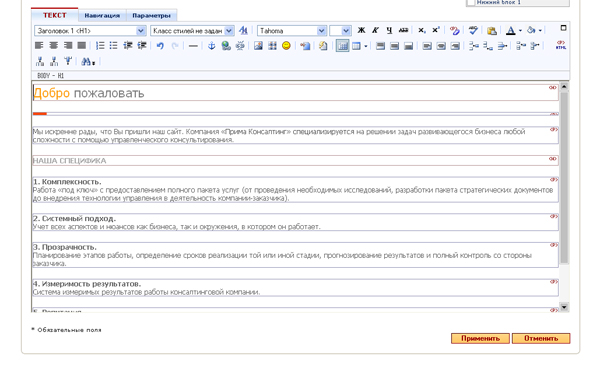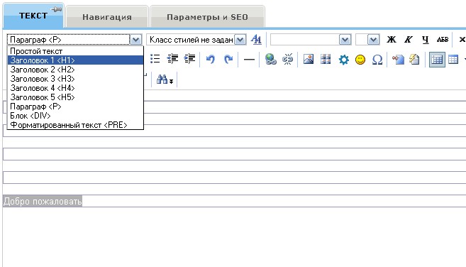 Далее в менеджере сайта, открыв главную страницу на редактирование, вставим на главную страницу приветственный текст: Вверху напишем «Добро пожаловать», оформим его заголовком <h1>